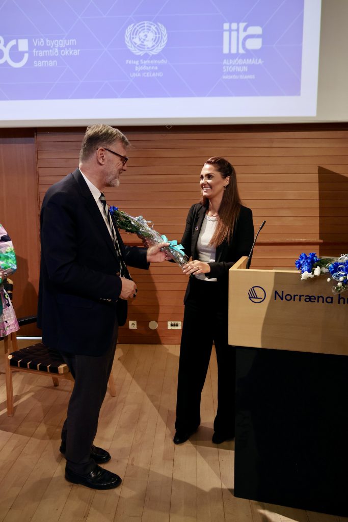 Þorgerður María Þorbjarnardóttir, formaður Landverndar, beindi sjónum að umhverfis- og loftslagsmálum og hvatti til hugrakkra skrefa í alþjóðlegri samvinnu. Hún lagði áherslu á að samvinna þvert á sérsvið væri lykilatriði til að ná sjálfbærum árangri til lengri tíma.