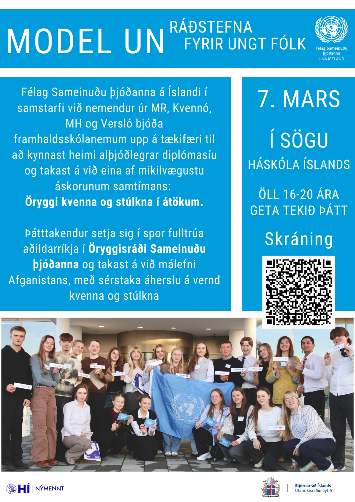 Félag Sameinuðu þjóðanna á Íslandi og nemendur úr UNESCO-skólunum MR, Kvennó, Versló og MH bjóða framhaldsskólanemum skemtilegt tækifæri til að kynnast heimi alþjóðlegrar diplómasíu – og takast á við eina af stærstu áskorunum samtímans: Öryggi kvenna og stúlkna í Afganistan. Verkefnið byggir á aðferðafræði Model UN (Hermilíkan Sameinuðu þjóðanna), þar sem nemendur setja sig í spor fulltrúa aðildarríkja Sameinuðu þjóðanna og leitast að því að auka réttlæti og tryggja frið, með það að markmiði að stuðla að fjölþjóðlegri samvinnu og sjálfbærni. Ráðstefnan er haldinn með stuðningu frá NýMennt á Menntavísindasviði Háskóla Íslands og Utanríkisráðuneytinu.